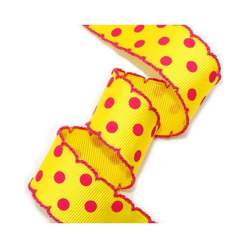 노랑/체리핑크 골직 큰 땡땡이 리본에 체리핑크색실 피코트리본입니다.